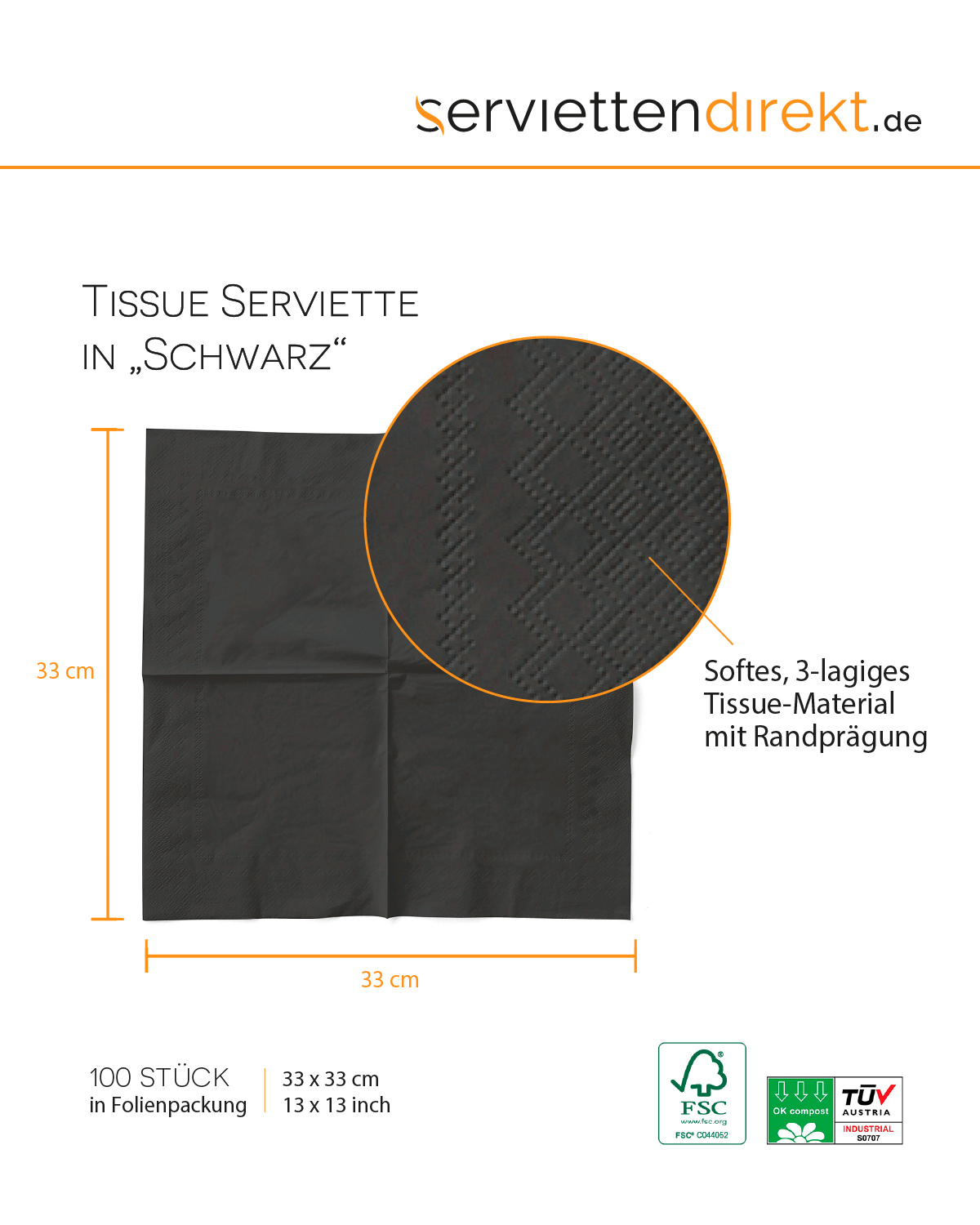 Tissue Serviette Schwarz, 33 x 33 cm, 1/8 Falz, 100 Stück - Mank