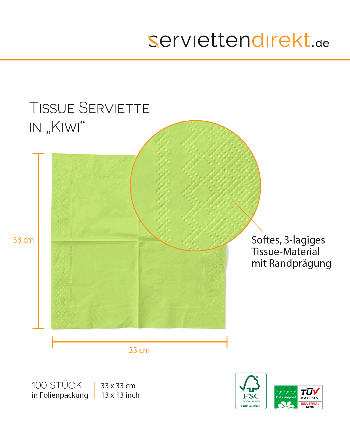 Tissue Serviette Kiwi, 33 x 33 cm, 1/8 Falz, 100 Stück - Mank