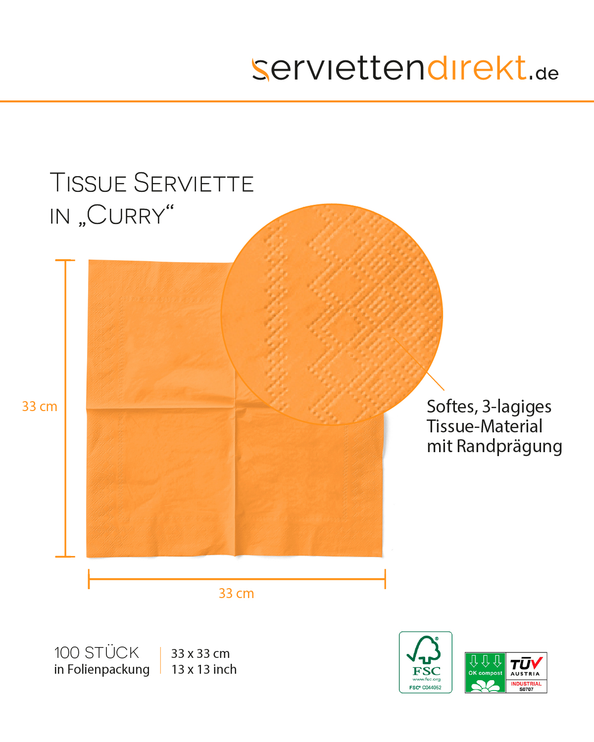 Die Tissue Serviette in CURRY/ORANGE ist die ideale Wahl, um Ihrem Event eine warme, einladende Atmosphäre zu verleihen. Mit einer praktischen Größe von 33 x 33 cm und dem klassischen 1/4-Falz-Design ist diese dreilagige Serviette in einer Packung mit 100 Stück erhältlich. Das hochwertige Tissue-Material sorgt für eine angenehme Haptik und exzellente Saugfähigkeit, was sie perfekt für festliche Anlässe, Herbstfeiern oder saisonale Events macht.