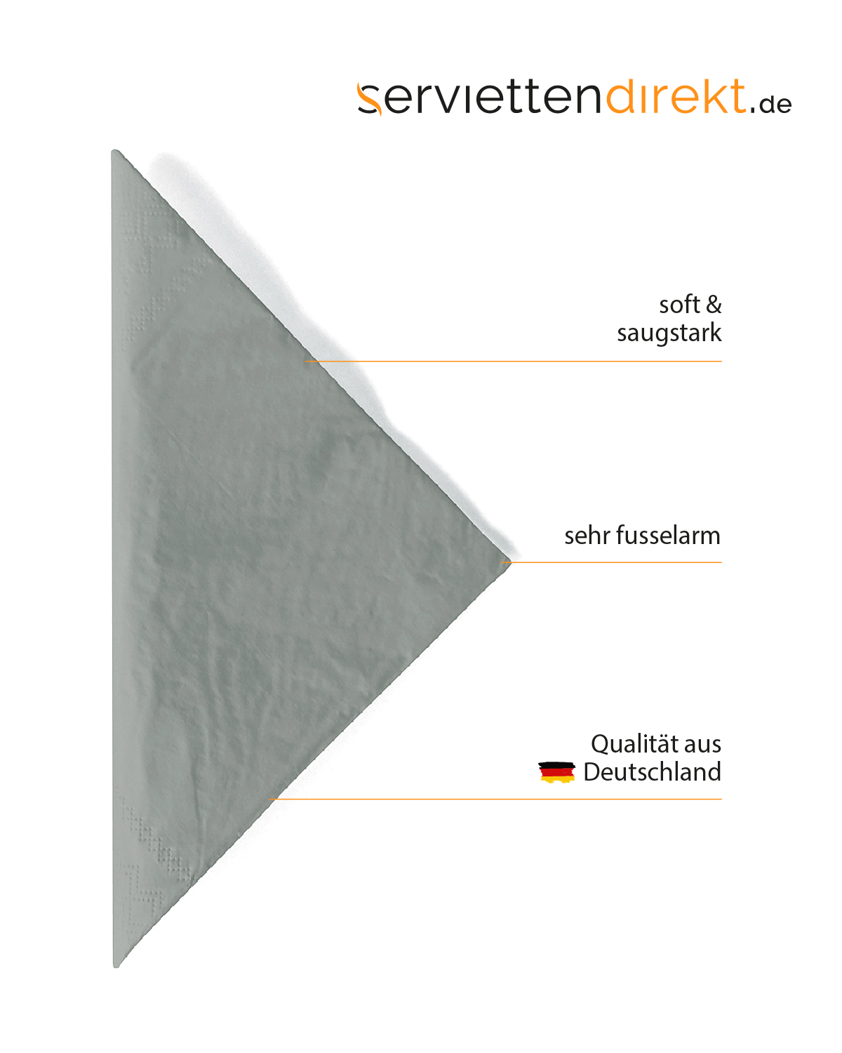 Die Trendfarbe GRAU besticht durch ihre unaufdringliche Eleganz, die sie zu einem Allrounder für eine moderne Tischdekoration macht. Sowohl solo, als auch in Kombination mit weiteren Designs und Farben aus unserem Sortiment, lassen sich mit unseren Tischprodukten mit der Farbe GRAU zeitlose Designideen verwirklichen. Diese Servietten aus softem Tissue in dreilagiger Qualität sind moderne Allround-Talente und vielfältig einsetzbar. Das hochwertige Material ist saugstark und reissfest, ideal für den Barbetrieb, den FrühStücksservice oder das Bistro.
