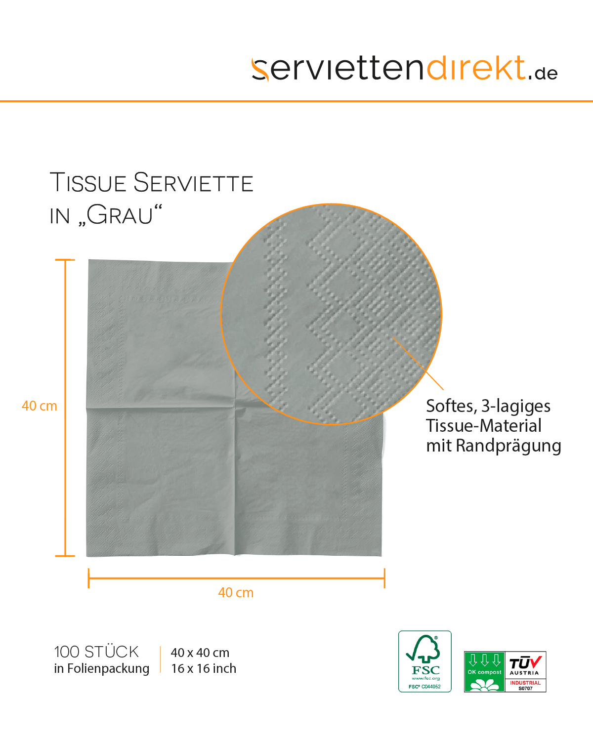 Tissue Serviette Grau, 40 x 40 cm, 1/8 Falz, 100 Stück - Mank