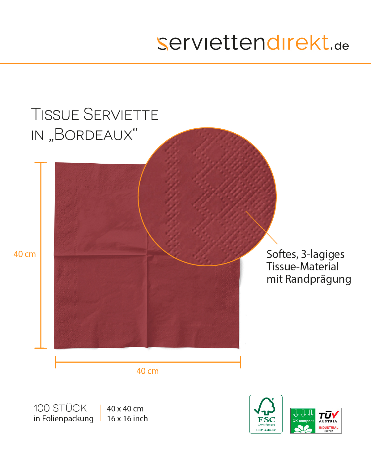 Tissue Serviette Bordeaux, 40 x 40 cm, 1/8 Falz, 100 Stück - Mank