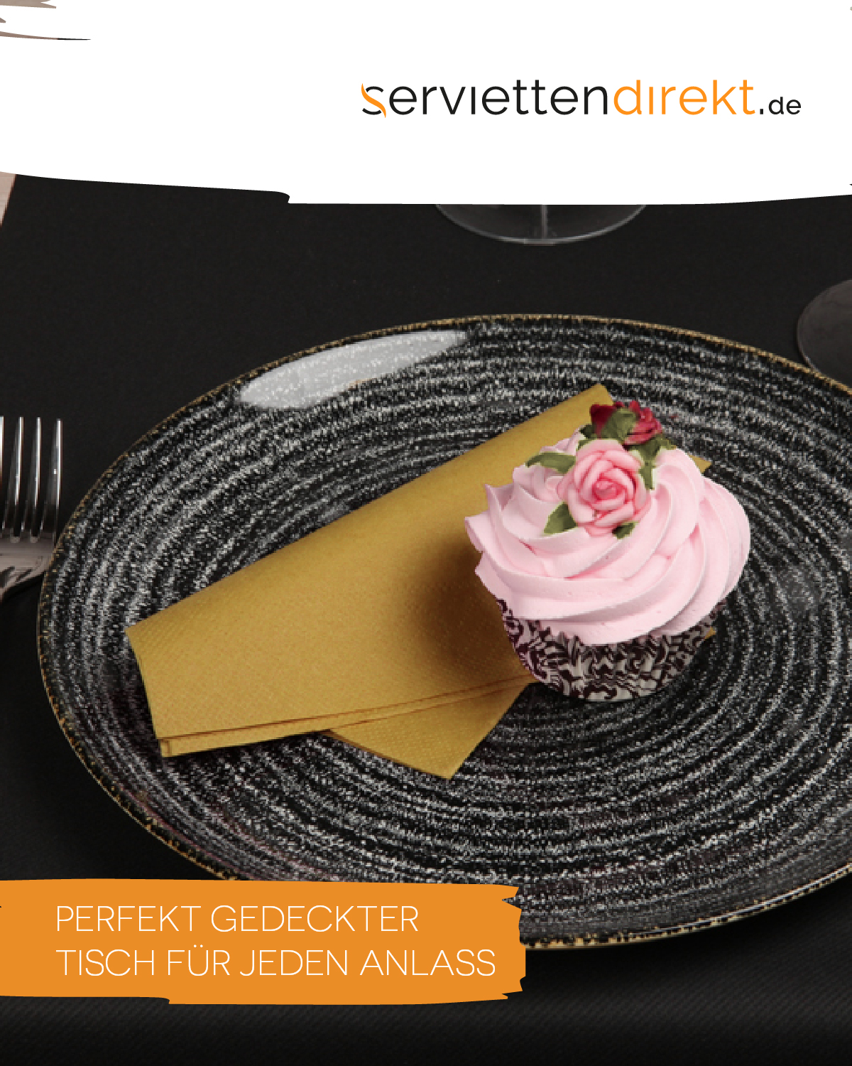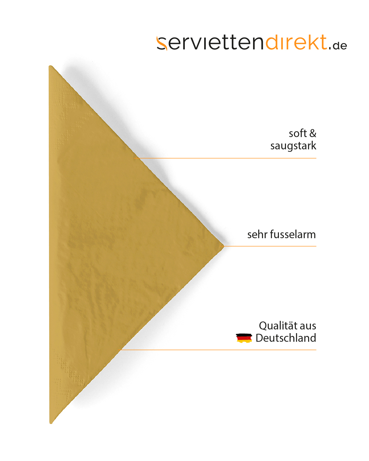 Einen festlichen Auftritt haben unsere Tischprodukte in der Farbe GOLD denn sie setzen glanzvolle Akzente in Ihrer Tischdekoration und untermalen so stilvoll jeden feierlichen Anlass. Kombinieren Sie unsere Tischprodukte in der Farbe GOLD mit weiteren Produkten unseres unifarbigen Sortiments, für einen glänzenden Eindruck! Unsere Servietten aus hochwertigem Tissue sind moderne Allrounder für nahezu jede Service-Situation. Das aufwendig hergestellte, dreilagige Material ist saugstark und reissfest, ideal für den Barbetrieb, FrühStücksservice oder das Cafe.