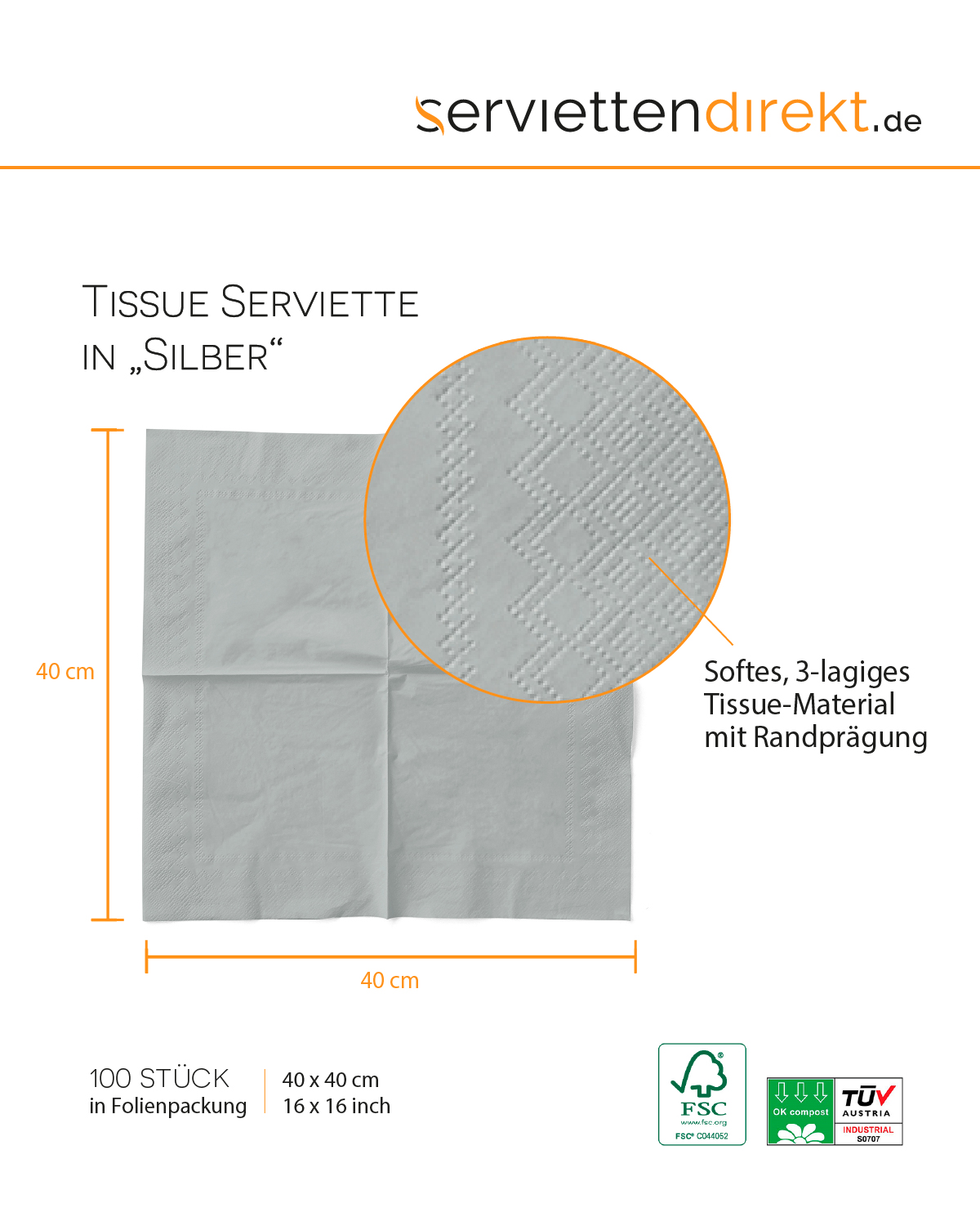 Tischprodukte in der Farbe SILBER präsentieren sich mit klassischer Eleganz, die Ihren Tisch in ein festliches Licht taucht. Feierlichen Anlässen verleiht dieser Farbton einen glänzenden Rahmen, der sich auch in der Kombination mit weiteren Produkten unseres unifarbigen Sortiments zeigt. Unsere Servietten aus saugstarkem Tissue sind Allrounder für nahezu jede Gelegenheit. Beim FrühStück, im Bistrobereich oder für die Bar , Tissue Servietten punkten als funktionale Allround-Talente mit Stil!