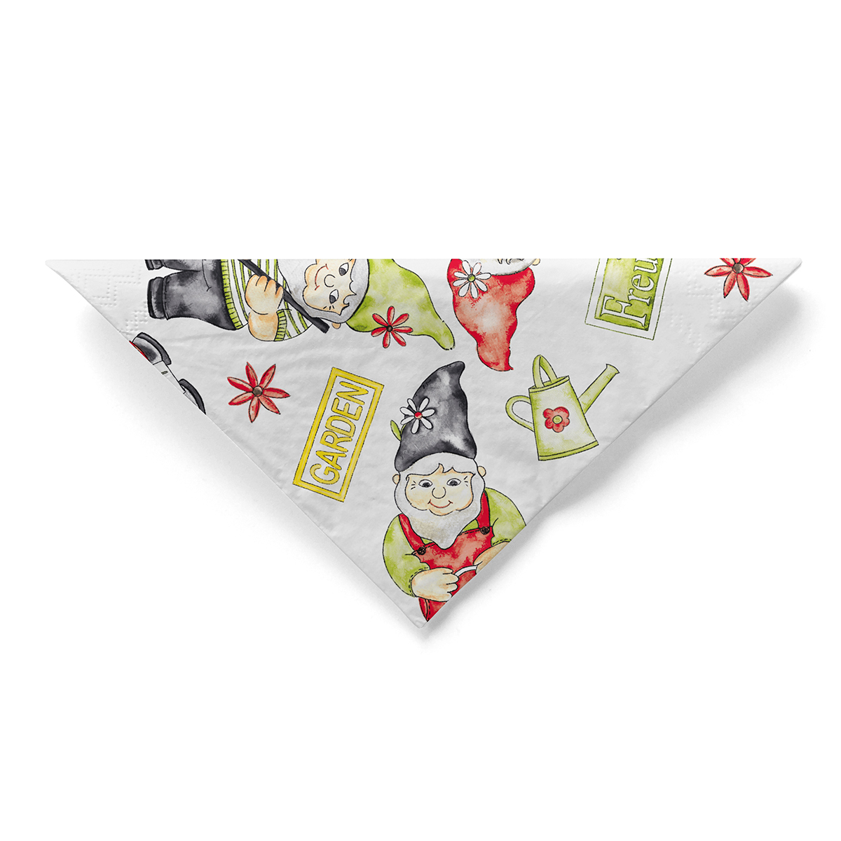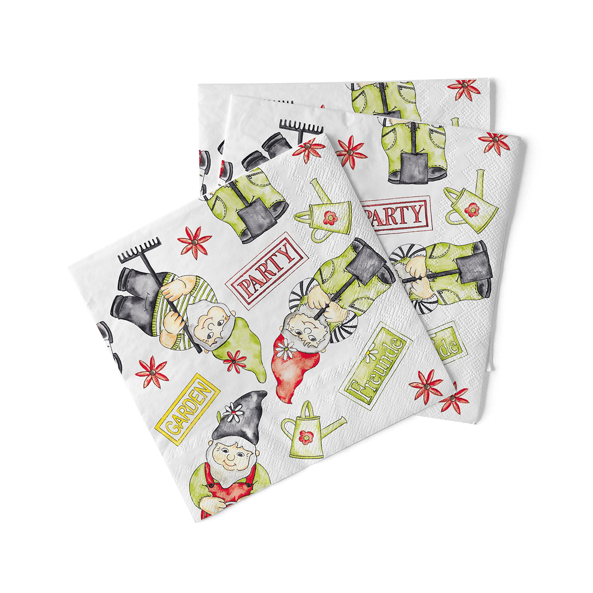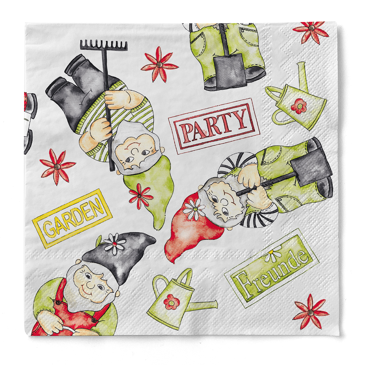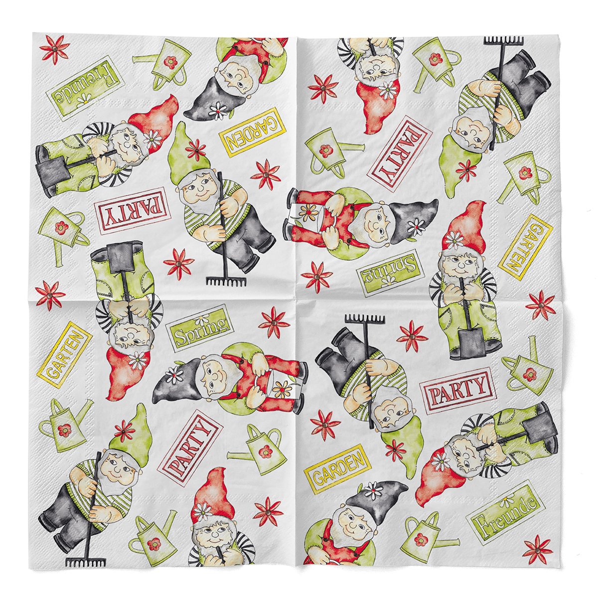 Das Design der Serviette PIT zeigt lustige Gartenzwerge mit Schaufel, Rechen und Eimer, die auf einem weißen Hintergrund lebendig zur Geltung kommen. Diese niedlichen und humorvollen Motive bringen eine fröhliche Stimmung und passen perfekt zu Garten- oder Frühlingsfesten.