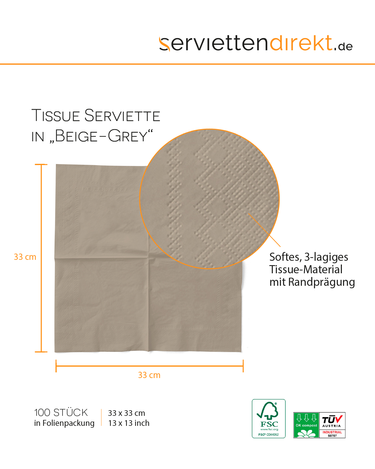 Tissue Serviette Beige Grey, 33 x 33 cm, 1/8 Falz, 100 Stück - Mank