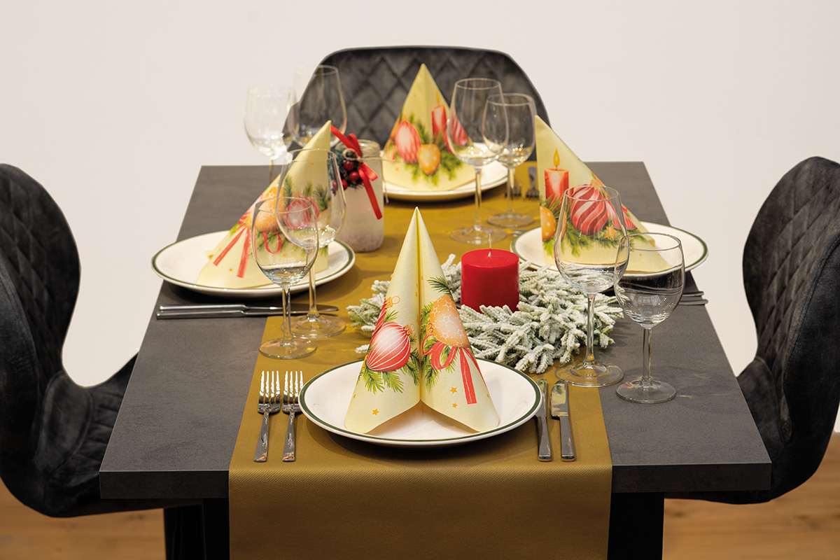 Die Mank Tissue Serviette Kerstin in Champagner verleiht jedem festlich gedeckten Tisch einen edlen und warmen Touch. Die dezente Champagnerfarbe passt perfekt zu stilvollen Weihnachtsfeiern, Hochzeiten oder glamourösen Partys und sorgt für ein elegantes Ambiente.