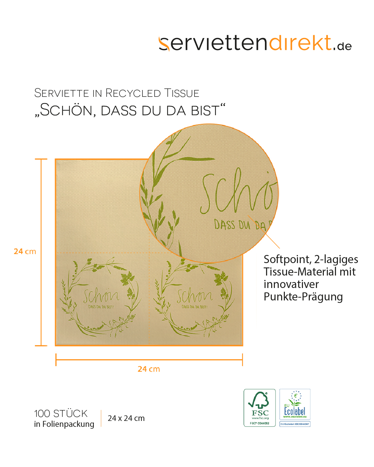 Tissue Serviette - Schön, dass du da bist! - in Recycled Tissue, 24 x 24 cm, 150 Stück - Mank