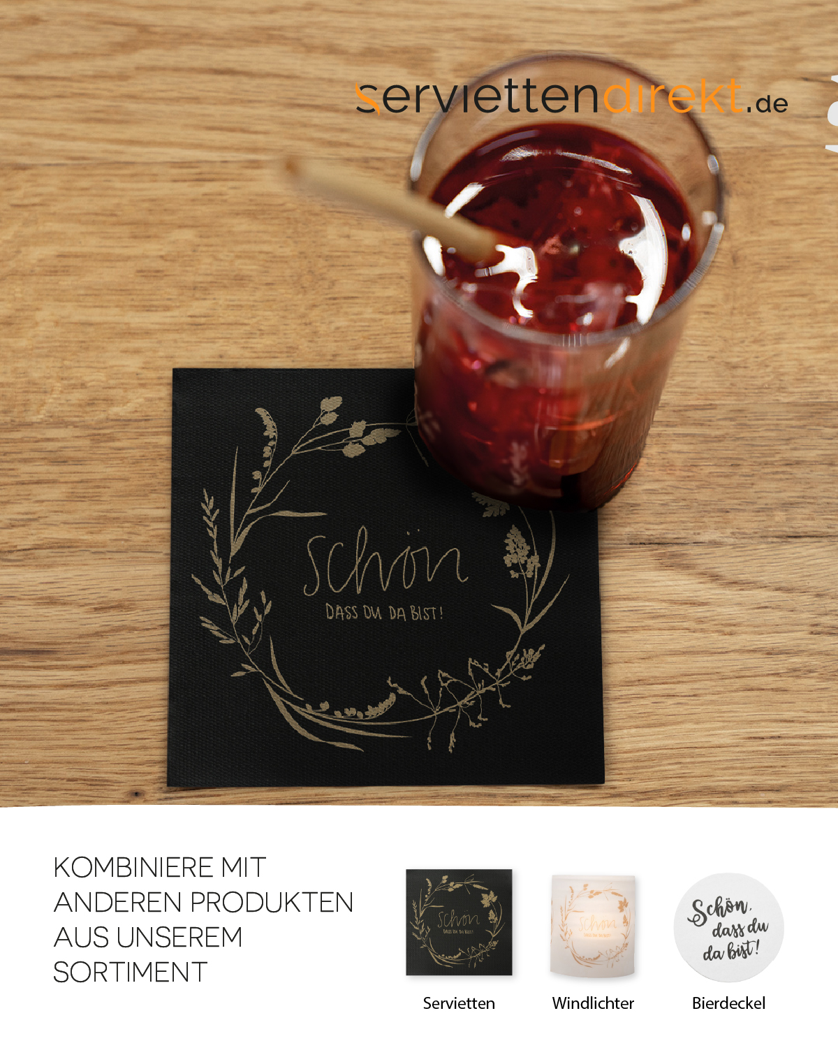 Die Softpoint Cocktail-Serviette „SCHÖN, DASS DU DA BIST“ kombiniert Funktionalität und elegantes Design auf stilvolle Weise. Mit einem charmanten Schriftzug im Blumenkranz auf einem tiefschwarzen Hintergrund setzt diese Serviette besondere Akzente und verleiht Ihrem Café oder Barbetrieb ein ansprechendes Ambiente.