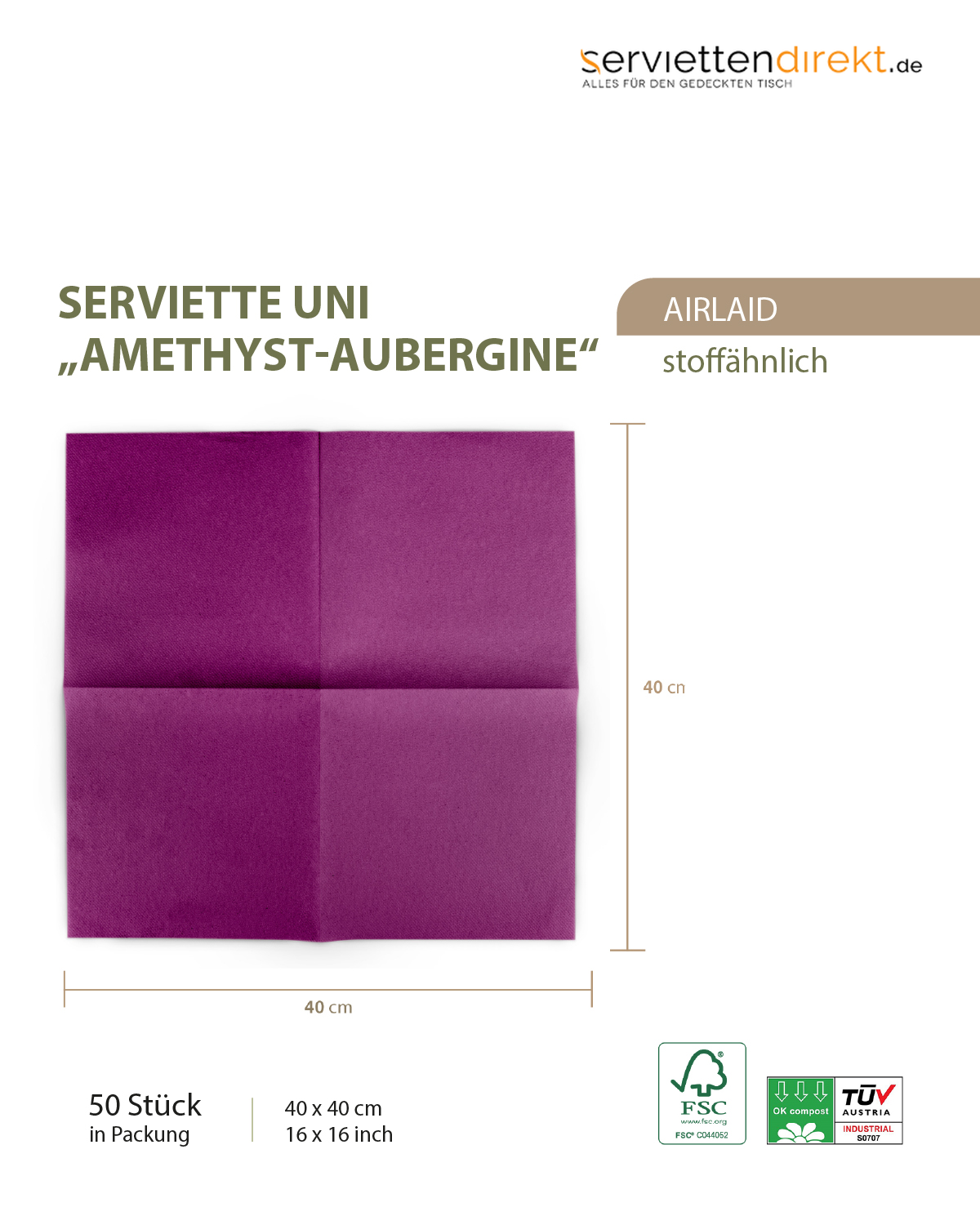 Airlaid Serviette Violett, 40 x 40 cm, 50 Stück - Mank