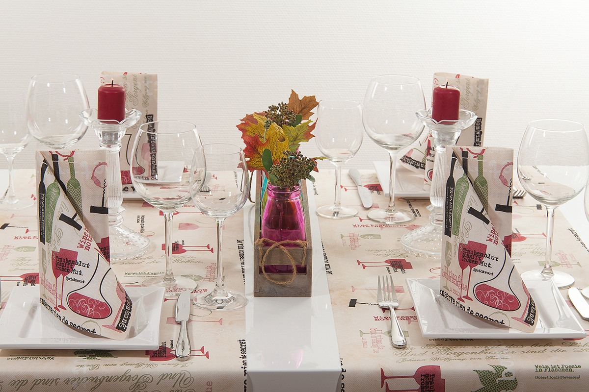 Der Wein ist Hauptmotiv des Designs BON VIN, das sich somit optimal für Weinlokale und Degustationen eignet. BON VIN ist in gedeckten Farbtönen gehalten und zeigt Ihren Gästen unterhaltsame Sprichwörter zum Thema Wein! Unsere hochwertigen Servietten aus stoffähnlichem Linclass-Airlaid, sind eine zeitgemässe und flexible Alternative zu herkömmlichen Stoffprodukten. Das samtweiche Material hat eine textilähnliche Struktur und lässt sich gut falten. Nach Gebrauch werden die Servietten einfach entsorgt , die Kosten für aufwendiges Reinigen und Bügeln entfallen!