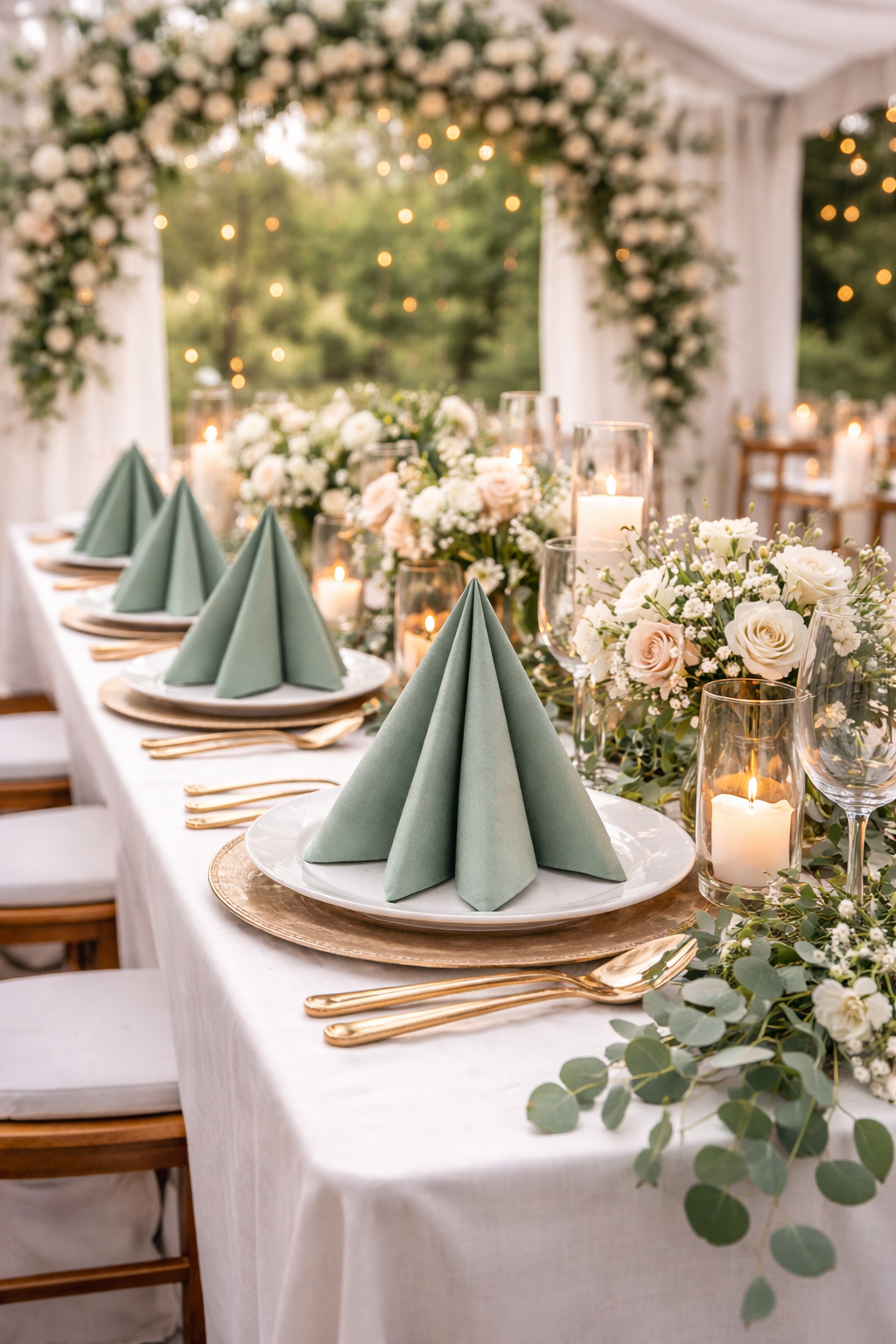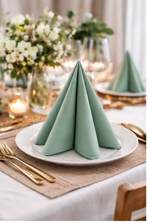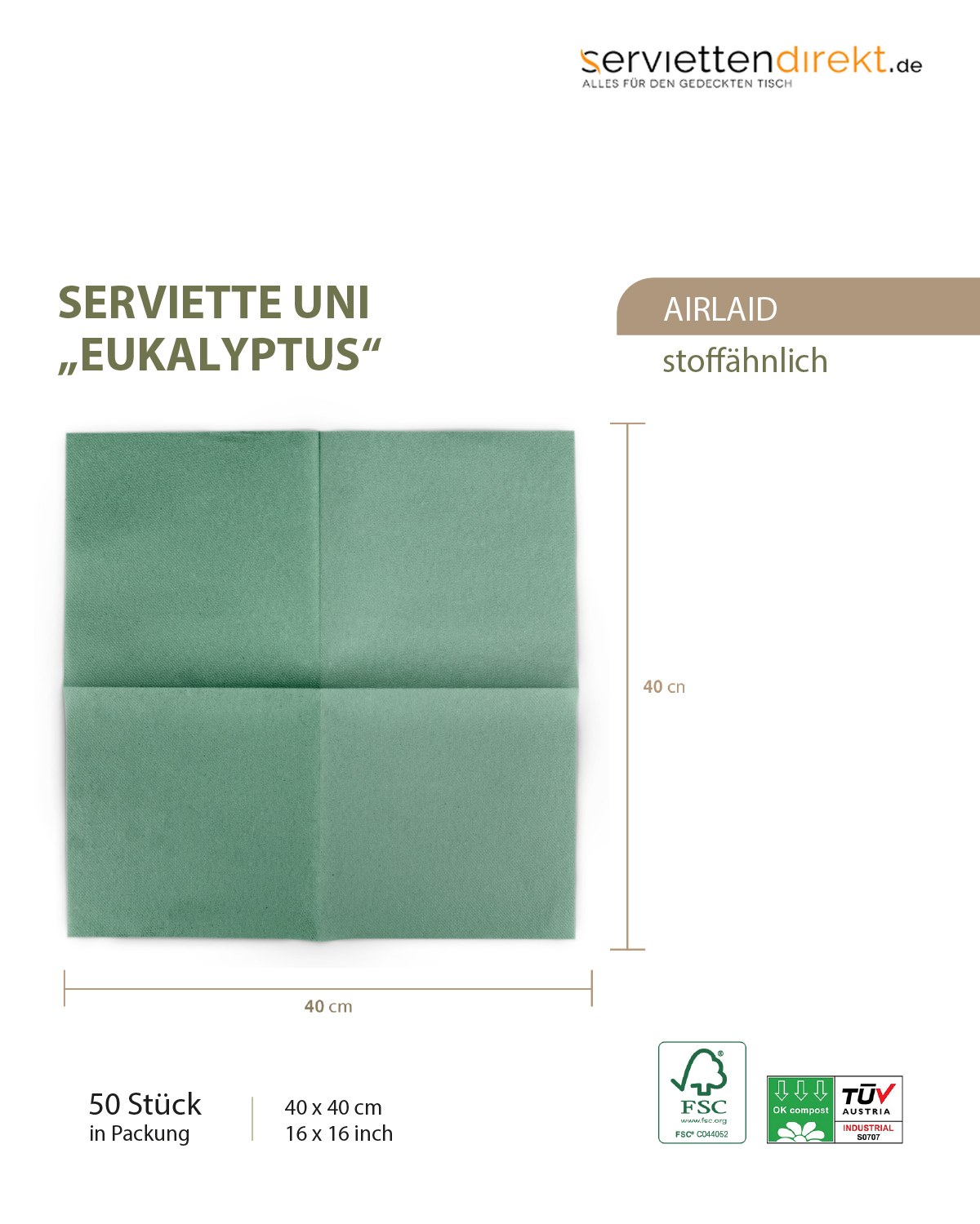Bestellen Sie noch heute unsere Airlaid Servietten in Eukalyptusoptik und verleihen Sie Ihrem Tisch eine natürliche und elegante Note, die Ihre Gäste beeindrucken wird.