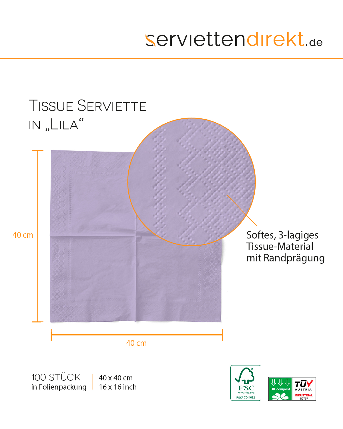 Tissue Serviette Lila, 40 x 40 cm, 1/8 Falz, 100 Stück - Mank