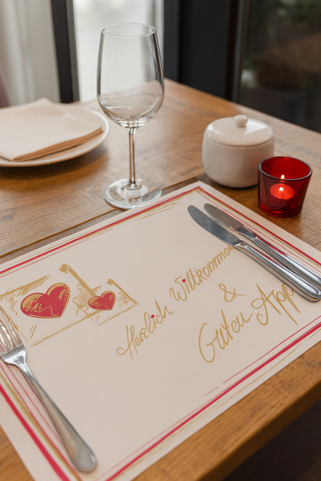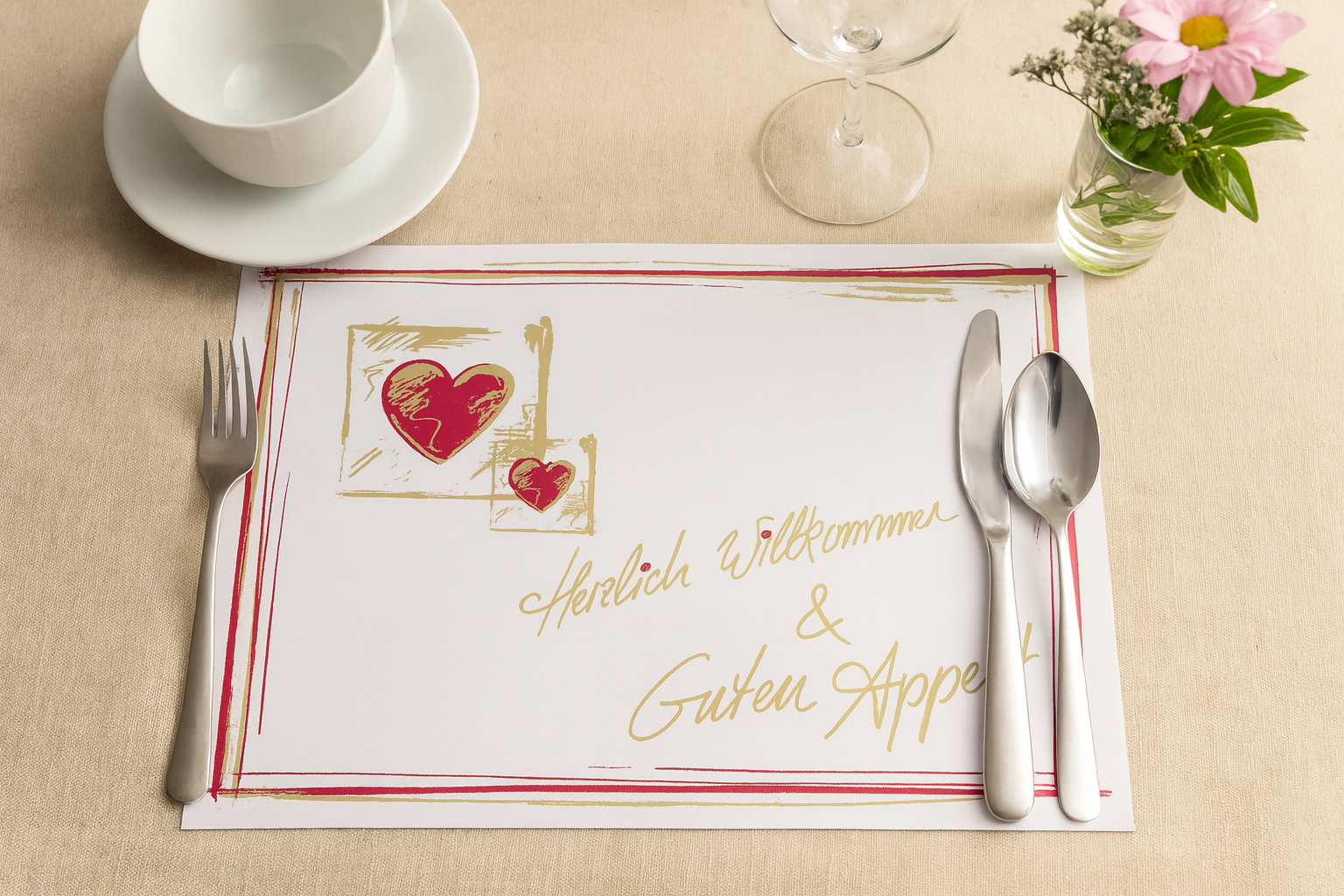 Die Tischsets aus stabilem Strukturpapier mit eleganter Prägung schützen Ihre Tische vor Kratzern und Verschmutzung und sind im Handumdrehen ausgetauscht. Überzeugen Sie sich von dieser modernen Art der Table Top Gestaltung! Unser Design HERZLICH WILLKOMMEN lässt sich durch seine einladende Motivgestaltung in vielen Situationen verwenden. Wann immer ein festlicher Anlass, ob im kleinen oder großen Kreis, geplant ist, begrüßt unser Design HERZLICH WILLKOMMEN Ihre Gäste mit seinem liebevoll gestalteten Motiv und setzt ein Statement für vollendete Gastlichkeit. Kombinieren Sie die Produkte unseres Designs HERZLICH WILLKOMMEN untereinander, oder mit weiteren Produkten unseres umfangreichen Sortiments!