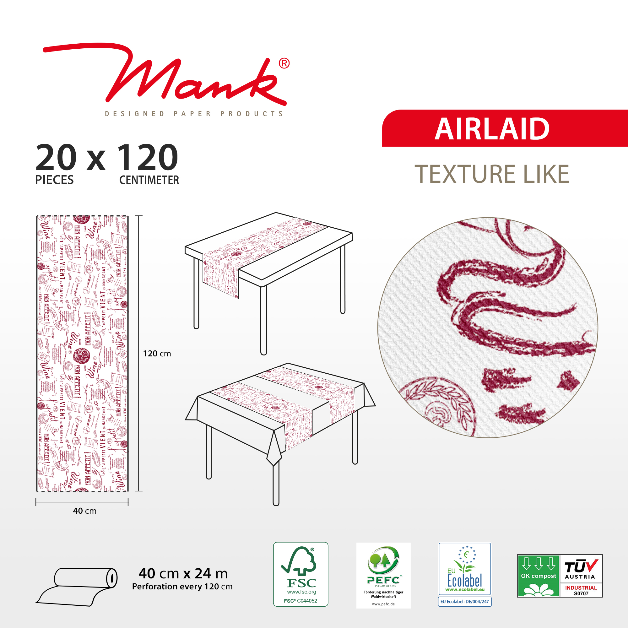 Airlaid Tischläufer Bill in Rot, 40 cm x 24 m, 1 Stück - Mank